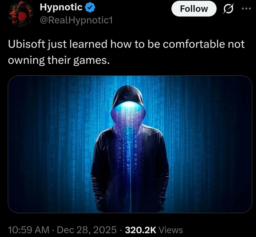 当黑客以这种方式修补游戏bug时,似乎也在暗示,游戏的问题从不仅在代码之上,而在人。2025年的最后,育碧又摔了次狗吃屎,可热爱他们的玩家,似乎并没有过多关心这次事件的结局育碧如何收场。