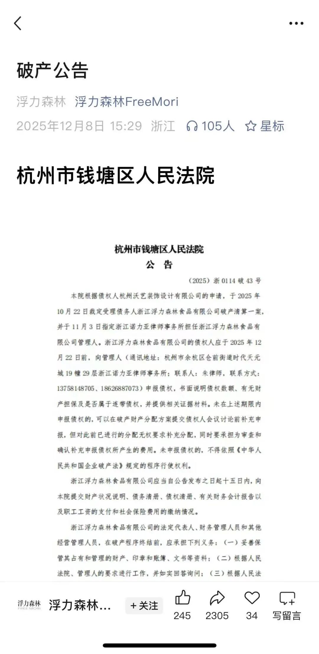 如今,它把法院的破产公告贴在自家公众号上,完成了从“蛋糕自由”到“破产自由”的终极飞跃。